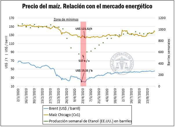 El precio del maíz tocaba en Chicago su menor valor en más de una década sobre finales del mes de abril, alcanzando los US$ 123/t para su contrato con vencimiento más cercano. En ese momento, el petróleo de tipo Brent alcanzaba su menor valor en 20 años, al cotizar cerca de los US$ 16 por barril, producto de una caída con pocos precedentes en la demanda de crudo como fruto de la paralización del transporte por causa de la pandemia, y de una guerra de precios entre Rusia y Arabia Saudita, por desacuerdos en el control del suministro.