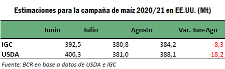 Por otra parte, las estimaciones productivas para la campaña 2020/21 en los Estados Unidos se ubicaban cercanas a las 406 millones de toneladas al inicio de la cosecha, en lo que hubiese marcado un récord productivo histórico, resultado de un área proyectada inicialmente en 39,3 millones de hectáreas.