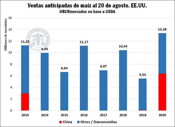 Por último, la demanda externa del maíz nuevo en los Estados Unidos alcanzó valores récord para este momento del año, producto de una intensa demanda por parte de China. A la fecha, EE.UU. registra ventas por 13,38 millones de toneladas por el maíz que comenzará a cosechar a mediados de septiembre, un 140% por encima del mismo momento del año pasado, con China concentrando casi el 50% de las ventas.