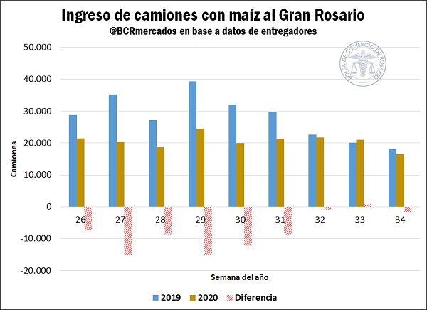 Consistente con el momento de la campaña, los ingresos de mercadería a puerto tendieron a disminuir en las últimas semanas: ingresaron aproximadamente 16.500 camiones portando maíz en la semana pasada (lunes 7 al domingo 23) al Gran Rosario, cayendo un 20% en relación con la semana previa. En las últimas cuatro semanas, el ingreso de camiones a puerto estuvo en el orden de los 80.500 camiones, o unas 2.250.000 toneladas, lo que marca una caída del 11% en relación con el año 2019 en el mismo período. En el total acumulado para la campaña, es decir, entre principios de marzo y la tercera semana de agosto, el ingreso de maíz al Gran Rosario se ubicó en el orden de las 16,6 millones de toneladas, cayendo un 8% entre campañas.