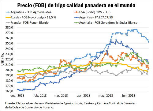 Los precios de trigo registrados en la Bolsa de Comercio de Rosario, continúan su tendencia bajista, medidos en dólares, disminuyendo respecto a la semana anterior en el segmento disponible. El precio de pizarra de la Cámara Arbitral de Cereales, en pesos, aumentó de $ 5.920 /t el jueves 21 de junio a $ 5.950 /t el día jueves 28. Sin embargo, en dólares el precio disminuyó de 216 USD /t el día jueves 21 a 212,5 USD /t el día jueves 28.