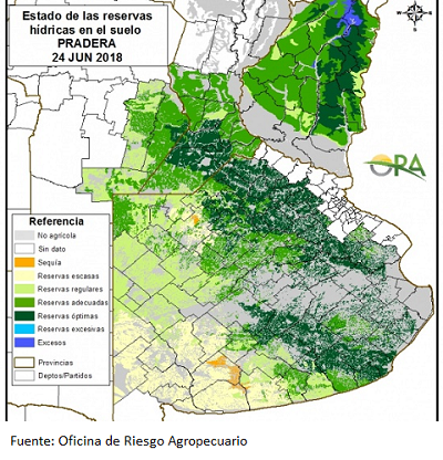 Los días sin lluvias permiten que las sembradoras de trigo avancen con fluidez superando el 50% del área intencionada a nivel nacional. Las reservas de agua del suelo para el cultivo van desde moderadamente escasas (en el oeste del país) a adecuadas y abundantes en el este. La mayoría de los lotes transitan las etapas vegetativas de emergencia y diferenciación foliar bajo muy buenas a excelentes condiciones y sin problemas fúngicos.