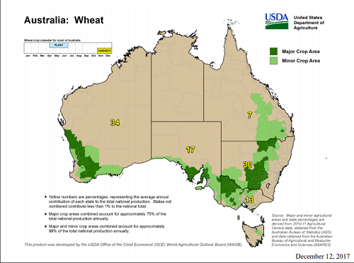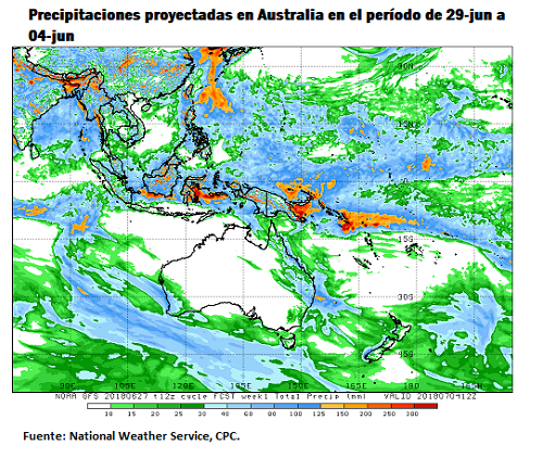 De acuerdo a la agencia Thomson Reuters, Australia se enfrenta a climas diversos en la extensión de su territorio. En el oeste, lluvias favorables en el mes de junio aliviaron las condiciones de sequía a las que se enfrentaba todo el país, y se pronostican más lluvias para la semana próxima. En el este y sur, sin embargo, las condiciones secas continúan estresando a los cultivos de trigo.