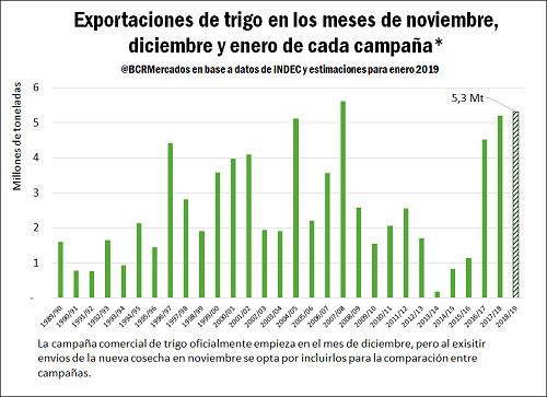 El volumen de exportaciones en los meses de noviembre (0,7 Mt) y diciembre de 2018 (2,1 Mt) más el del mes de enero 2019 alcanzó un total acumulado de 5,3 Mt. Este valor es el segundo más alto de los últimos 30 años, por detrás de la campaña 2007/08. El volumen de exportación de enero de 2,5 Mt, se calcula en base a Line-ups con buques que se estima que ya partieron de los puertos de Argentina en todo el mes de enero. Con un estimado de nivel de exportaciones de 12,7 Mt para toda la campaña 18/19 (Dic-18/Nov-19), en los meses de diciembre y enero ya se exportó más un 42 % de lo proyectado para el año. El año pasado para la campaña 17/18 este valor era del 44 %, mientras que para la campaña 16/17 este valor alcanzaba un 35 %.
