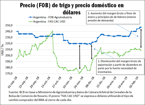 Como ya se había remarcado en anteriores informes, este abultado cronograma de envíos en los meses de diciembre y enero iba a presentar una mayor demanda de corto plazo por parte de los exportadores para hacerse de mercadería y así cumplir con los embarques en este período. El sector ya presentaba bajos stocks al inicio de la campaña 18/19 luego del fuerte aumento en las exportaciones de trigo del año pasado. La combinación con un recorte en la producción esperada de trigo, que luego de heladas y granizo en ciertas zonas pusieron un techo a la producción nacional, hizo que el precio del mercado doméstico (FAS) subiera más que el precio que se negociaba por la mercadería puesta en buque (precio FOB). Esto hizo achicar el margen bruto de exportación en los meses de diciembre y enero. El margen bruto de exportación se calcula como la diferencia entre ambos precios y no toma en cuenta de pago de retenciones y costos de fobbing. Si se hace el análisis con el FAS teórico calculado por la BCR se llega a las mismas conclusiones que ahí se exponen.