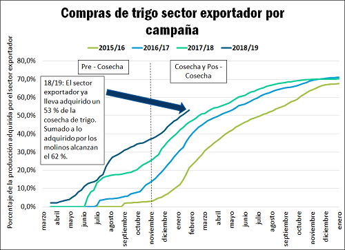 Con respecto al resto del trigo que queda por comercializar, la Secretaría de Agroindustria informa que al 30 de enero el sector exportador ya lleva adquirido casi 10 Mt de trigo 18/19. Respecto a la cosecha – estimada por GEA/BCR en 18,7 Mt – equivale al 53 % del total. Este valor presenta un ritmo acelerado si se compara la dinámica de otras campañas, el cual ya se viene notando en semana a semana. Sumado a lo adquirido por el sector industrial (molinos), el total asciende a 11,5 Mt, equivalente al 62 % del total. Al mismo tiempo, los negocios de exportación (DJVE) del cereal informado a la Secretaría de Agroindustria suman al 30 de enero 7,3 Mt. Este valor se encuentra muy por encima de los negocios realizados el año pasado de 6,4 Mt, los cuales acompañan el mayor volumen cosechado en esta campaña respecto a la anterior.