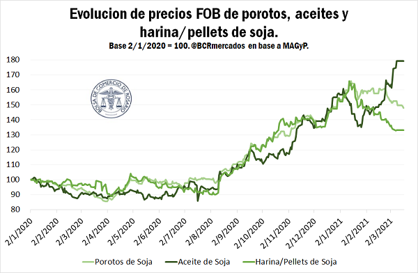 Luego de la marcada caída que tuvo lugar en los meses de marzo y abril del año pasado cuando se desató la crisis global causada por la pandemia, los precios internacionales del aceite de soja han evidenciado un ascenso sorprendente y el viernes pasado alcanzaron en Chicago los US$ 1.254 /t, un 175% más que hace un año y su valor más elevado desde septiembre de 2012. La situación en nuestro país, en tanto, no ha quedado exenta de lo acontecido en los mercados internacionales, y el precio FOB del aceite de soja alcanzó los US$ 1.260 /t esta semana, un 97% más que hace exactamente un año.