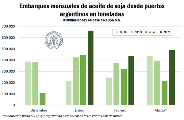 De hecho, tal como se puede apreciar en el gráfico anterior, los embarques de aceite de soja en el 2021 han sido constantemente superiores a lo ocurrido en igual mes de los últimos tres años. Si bien el elevadísimo volumen en enero respondería a una recuperación en la logística luego de que el paro de aceiteros en diciembre virtualmente frenara la producción y el despacho de aceites, el elevado volumen en los meses siguientes responde a la robusta demanda externa.