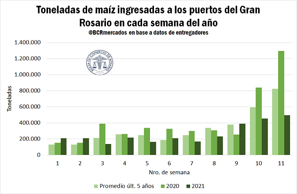 En lo que respecta al maíz, si bien aún no hay datos oficiales sobre el avance de la cosecha del temprano, el ingreso de camiones a los puertos puede operar como un indicador útil para observar el avance en la recolección del cultivo. Tal como se aprecia en el siguiente gráfico, el arribo de toneladas del cereal a las terminales portuarias ha aumentado en las últimas tres semanas, lo que da cuenta del avance en las tareas de recolección, pero se encuentra muy por detrás de lo ocurrido en los ciclos previos. De hecho, comparando la semana 11 vs igual semana del año anterior, la caída en el ingreso de mercadería es del 66%, y vs. el promedio de los últimos cinco años del 46%.