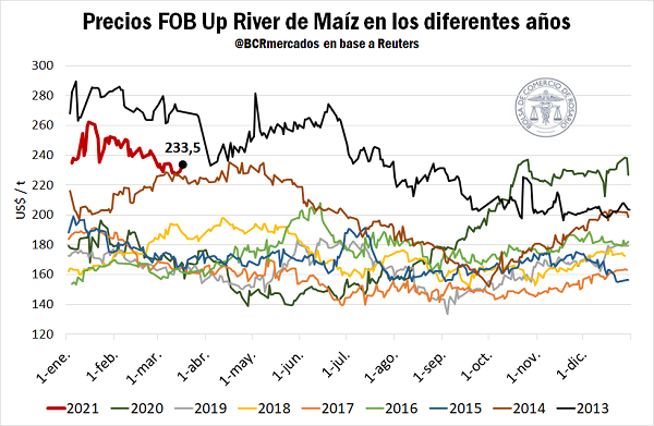 Por último, en lo que respecta a precios del maíz, la evolución de los precios FOB en Argentina ha evidenciado un descenso desde mediados de enero. Actualmente, el precio FOB en el Up River se ubica en US$ 233,5 /t, el valor más elevado desde el 2013 para este momento del año. Sin embargo, comparando con los precios FOB de los otros dos principales países productores, Estados Unidos y Brasil, nuestro país es el que presenta el FOB más bajo, ya que el precio del maíz en el puerto de Paranagua el día 17/03 se ubicó en US$ 276 /t, mientras que en los puertos del Golfo cotizaba US$ 253 /t. De todas maneras, esta disparidad refleja las condiciones de oferta del cereal internamente, y al estar iniciándose la cosecha en nuestro país, existe cierta abundancia de oferta que presiona a los precios, cosa que no ocurre en los demás países en los que la campaña comercial ya se encuentra más avanzada.