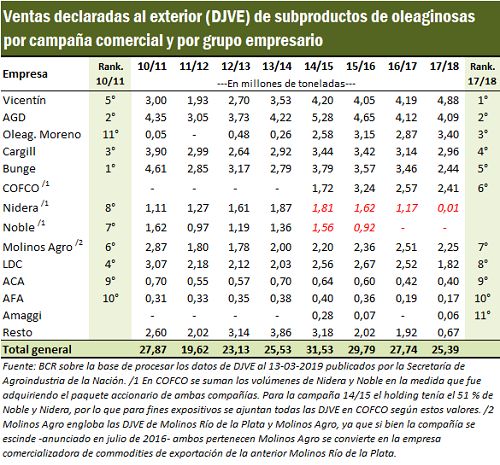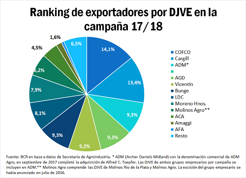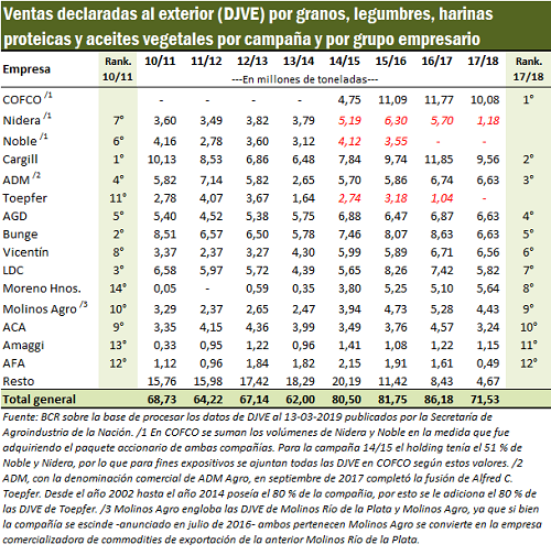 En base a los datos de las declaraciones juradas de exportación (DJVE), los compromisos de ventas externas de granos y subproductos (trigo, maíz, soja, cebada, sorgo, girasol, arroz, maní, entre los granos, más las harinas y los aceites vegetales y algunas legumbres) habrían ascendido a 71,5 millones de toneladas en la campaña agrícola 2017/18, teniendo en cuenta que faltaba medio mes para cerrar marzo, el último mes de la campaña comercial de soja. Para ver la evolución de los diferentes actores en la exportación de granos y subproductos en Argentina, baste observar los compromisos de embarque con el exterior que fue asumiendo cada grupo empresario en cada ciclo comercial.