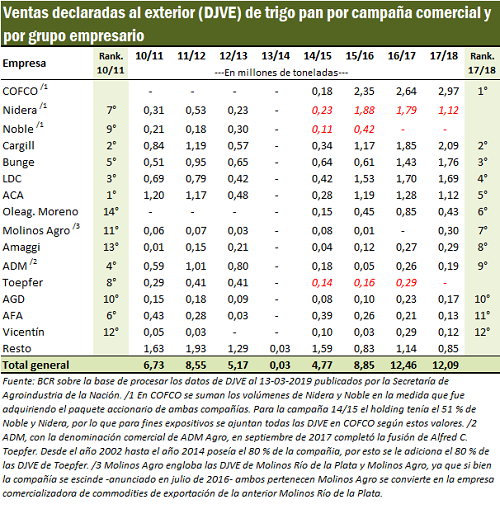 A nivel producto, en las DJVE de trigo de la campaña 17/18, el holding COFCO lideró el podio con 2,97 Mt vendidas. En el segundo puesto le sigue de cerca Cargill con 2,09 Mt. En este producto, COFCO lleva en el primer puesto desde la campaña 15/16, campaña en la cual se termina de comprar el paquete accionario de Nidera y Noble (la compra del paquete se efectiviza en fines de 2015 y mediados de 2016 para Nidera y Noble respectivamente).