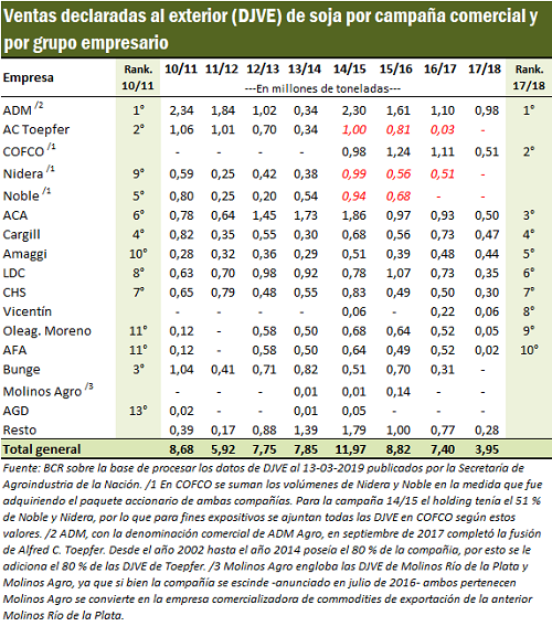 En el caso de la campaña de soja 17/18 atravesada por la sequía, ADM (Archer Daniels Midland) se ubicó en primer lugar con casi 1 Mt de toneladas anotadas en las DJVE. La empresa de capitales estadounidenses viene liderando el podio de exportación de poroto de soja, casi continuamente, desde la campaña 10/11. (A la empresa ADM se le adicionan el 80 % de las DJVE de Toepfer, ya que el 80 del paquete accionario fue adquirido por ADM en el cuarto trimestre de 2002).
