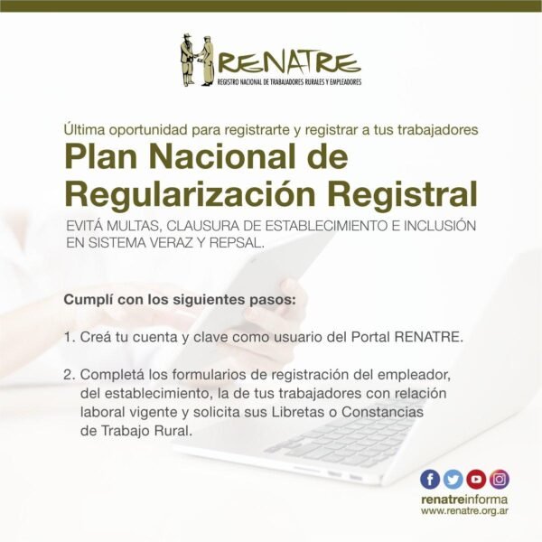 El RENATRE (Registro Nacional de Trabajadores Rurales y Empleadores) lanzó el Plan Nacional de Regularización Registral que tiene como objetivo que los empleadores puedan regularizar su situación registral y la de sus trabajadores, así evitar multas y clausura de establecimientos.