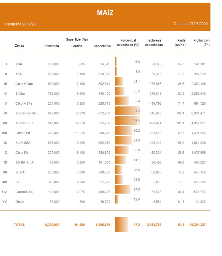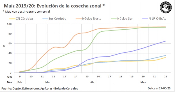 Hacia las zonas Oeste de Buenos Aires-Norte de La Pampa, Cuenca del Salado y el Centro de Buenos Aires la cosecha de planteos tempranos transita su tramo final, mientras la recolección de lotes tardíos registra buenos rindes. En la zona Centro-Norte de Córdoba, los rindes superan las expectativas iniciales en los departamentos del centro de la región. En los Núcleos Norte y Sur, los productores avanzan con la cosecha de los planteos tardíos y de segunda ocupación.