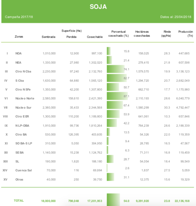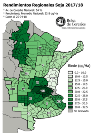Pese al mal clima registrado durante los días previos la cosecha continuó avanzando a buen ritmo, elevando la superficie recolectada al 54 % del área apta. El progreso intersemanal fue de 14,4 puntos y el adelanto interanual ya supera los 21,7 puntos porcentuales. A escala nacional ya se recolectó un 65,5 % del área sembrada como soja de primera, mientras que la superficie de segunda ya fue cosechada en un 22,4 %. Junto con el avance de cosecha, el rinde medio nacional descendió a 23,8 qq/Ha. A medida que la recolección avance sobre lotes tardíos, siembras de segunda y sobre cuadros ubicados en las regiones NOA y NEA, el rinde promedio nacional continuará descendiendo hasta finalizar próximo a 22 qq/Ha, un 30 % por debajo al cierre del ciclo previo (2016/17: 31,9 qq/Ha) y un 25 % por debajo al rinde promedio de las últimas cinco campañas (Prom 12/13-16/17: 29,6 qq/Ha).