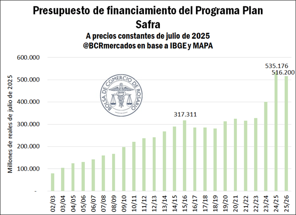 El Plan Safra es coordinado por el Ministerio de Agricultura y Ganadería (MAPA) y combina recursos públicos, privados y obligaciones crediticias para el sistema financiero. Para el próximo ciclo agrícola movilizará 516.000 millones de reales, una cifra que refleja una expansión de más de seis veces en términos reales desde comienzos de los años 2000.