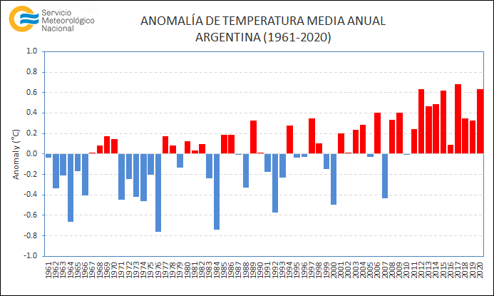 En Argentina y el resto del mundo, las temperaturas siguen en aumento. El 2020 no fue la excepción y quedó a muy pocas décimas de ser uno de los años más calurosos en el país. Con una anomalía de +0.63°C el último año se ubicó en 2° lugar, solo superado por las temperaturas del 2017.