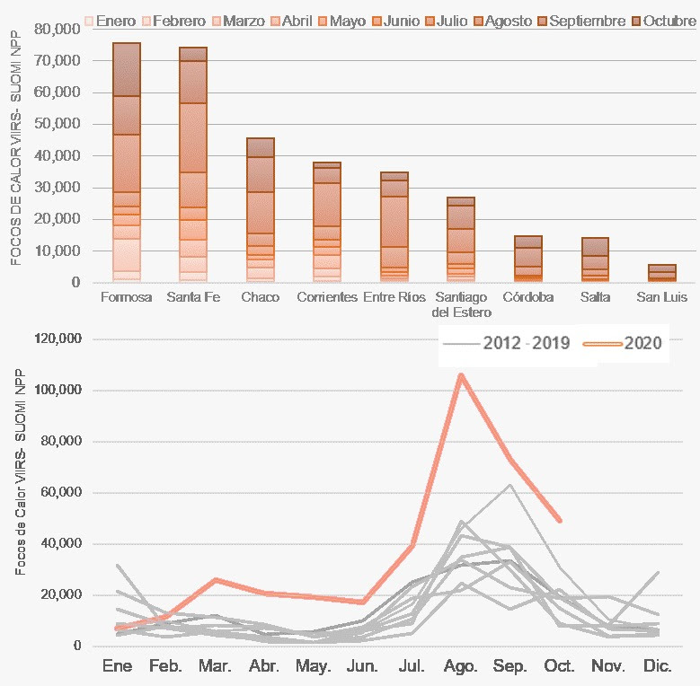 Según los datos satelitales y la información suministrada por el Ministerio de Ambiente y Desarrollo Sostenible, el 2020 se convirtió en el año con mayor cantidad de focos de incendios. Solamente en el mes de agosto se registró un total que superó los 100.000 focos de calor y las provincias de Formosa y Santa Fe una alrededor de 80.000 focos tuvieron cada en el año.