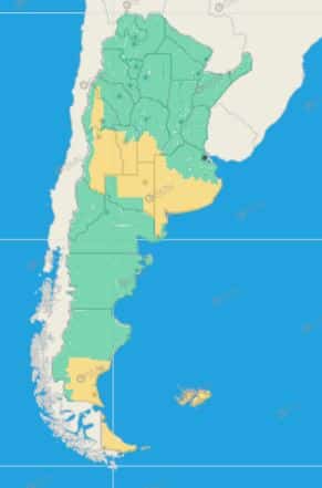 Buenos Aires: Este de General Lavalle – La Costa – Pinamar – Sudeste de General Juan Madariaga – Villa Gesell – Ayacucho – Balcarce – General Guido – Maipú – Noroeste de General Juan Madariaga – Noroeste de Mar Chiquita – Oeste de General Pueyrredón – Costa de General Pueyrredón – Costa de Mar Chiquita – General Alvarado – Zona serrana de Benito Juárez – Zona serrana de Loberia – Zona serrana de Necochea – Zona serrana de Tandil – Azul – Rauch – Tapalqué – Zona baja de Benito Juárez – Zona baja de Tandil – Costa de Lobería – Costa de Necochea – Costa de San Cayetano – Costa de Tres Arroyos – Adolfo Gonzales Chaves – Centro de Lobería – Norte de Coronel Dorrego – Norte de Necochea – Norte de San Cayetano – Norte de Tres Arroyos – General La Madrid – Laprida – Olavarría -Norte de Bahía Blanca – Oeste de Patagones – Oeste de Villarino – Puan – Zona baja de Coronel Pringles – Zona baja de Coronel Suárez – Zona baja de Saavedra – Zona baja de Tornquist – Adolfo Alsina – Daireaux – Guaminí – Pellegrini – Salliqueló – Trenque Lauquen – Tres Lomas – Florentino Ameghino – General Villegas – Rivadavia – Bolívar – Carlos Casares – Carlos Tejedor – Hipólito Yrigoyen – Pehuajó