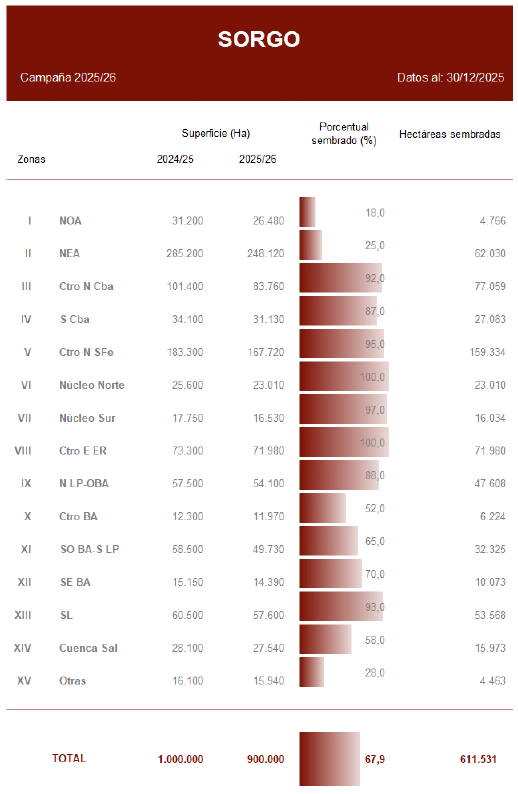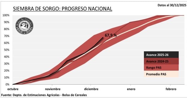 La campaña 2025/26 de sorgo granífero empieza a mostrar señales claras de dinamismo. En apenas dos semanas, la implantación registró un salto significativo y ya supera dos tercios del área proyectada a nivel nacional, aunque el ritmo de avance no es uniforme y sigue muy condicionado por el clima según la región.
