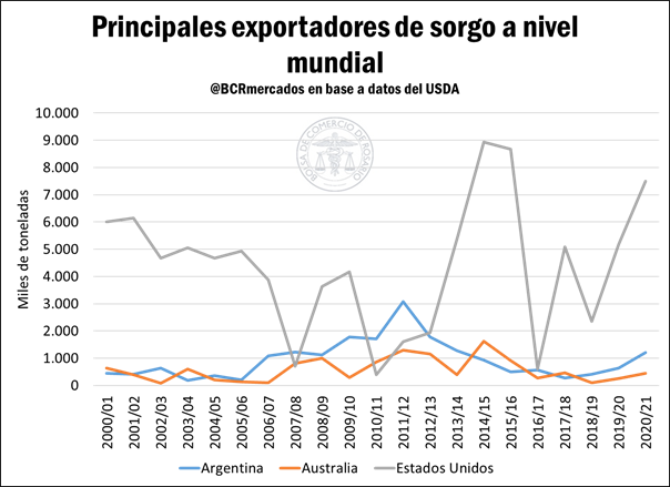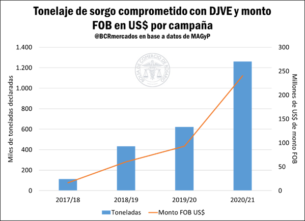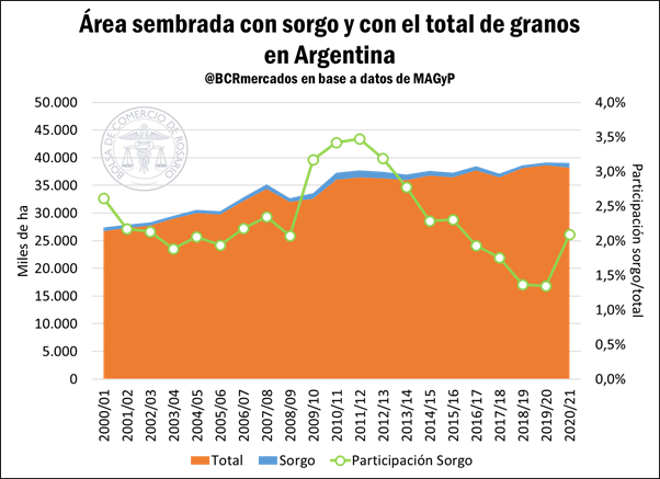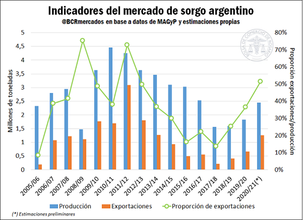 El aumento en la superficie sembrada y la aplicación de un paquete tecnológico más ambicioso, harán posible aumentar la producción nacional, que podría estar en el orden de 3,0-3,5 millones de toneladas, consecuentemente, se incrementa el saldo exportable del grano. Es que, el sorgo, que históricamente se lo utilizó como forraje y para la producción de balanceados para la alimentación animal, ha adquirido una importante faceta exportadora llegando a vender externamente el 70% de la producción nacional (campañas 2008/09 y 2011/12). Si bien en los últimos años cayó la proporción de embarques de sorgo respecto a la producción total, con la llegada de la campaña 2020/21 se espera que recobre relevancia el mercado externo.
