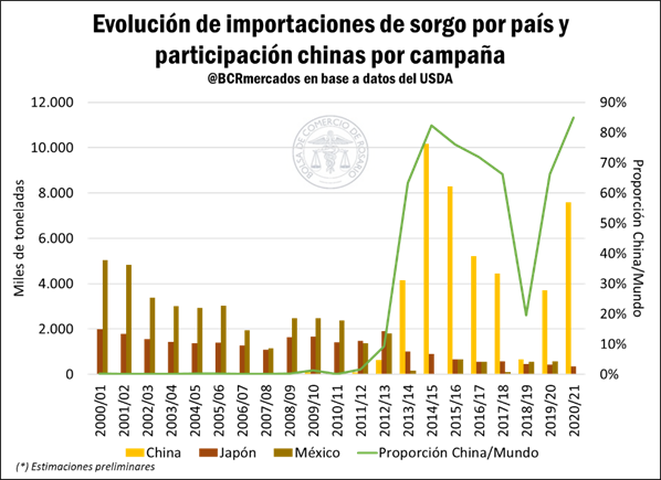Por el lado de la demanda, el principal comprador de sorgo a nivel internacional es China, secundado por Japón y en tercer lugar se encuentra México, quien supo ser durante el inicio del nuevo milenio el principal destino del sorgo mundial. Cabe destacar que el comercio internacional del sorgo supone un mercado de poco más de 7 millones de toneladas, según el promedio de las últimas campañas. De todas formas, según las estimaciones del Departamento de Agricultura de los Estados Unidos (USDA), en la campaña 2020/21 las importaciones mundiales de sorgo alcanzarán los 9 millones de toneladas y Argentina proveerá cerca de 1 millón.