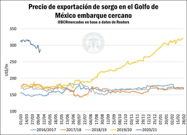 La situación de elevada demanda llevó los precios de exportación de sorgo a incrementarse desde mediados del año pasado. En el Golfo de México, el valor de esta gramínea llegó a superar los US$ 300/tn durante febrero, más de US$ 100 por encima del registro de agosto de 2020. A pesar de haber tenido una disminución en el último mes y medio, los valores se encuentran aún muy por encima de lo que se presentaba a la misma altura de las últimas campañas.