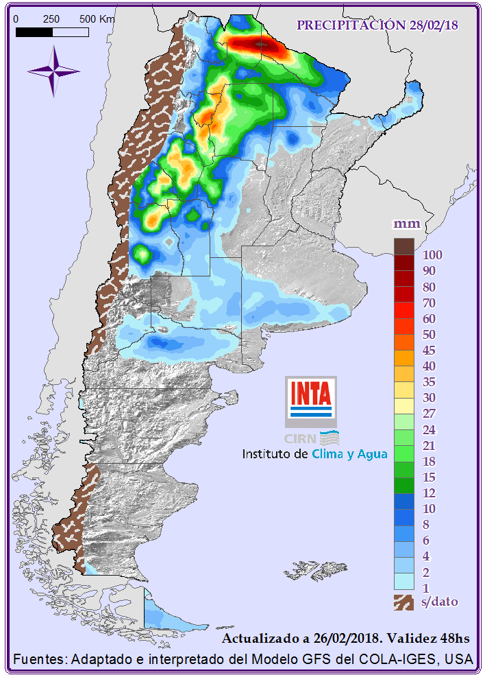 Sobre el extremo norte del país se presentaría tiempo nuboso con vientos del noreste y probabilidad de lluvias y tormentas de variada intensidad; algunas podrían ser localmente intensas con abundante caída de agua y ráfagas sobre Salta (este), Formosa y Chaco (norte). Se espera nubosidad variable con probabilidad de algunos chaparrones aislados sobre Córdoba. Sobre la Patagonia centro y sur, se registrarían vientos que rotarán al sector sudoeste con marcado descenso de las temperaturas y lluvias dispersas Santa Cruz.