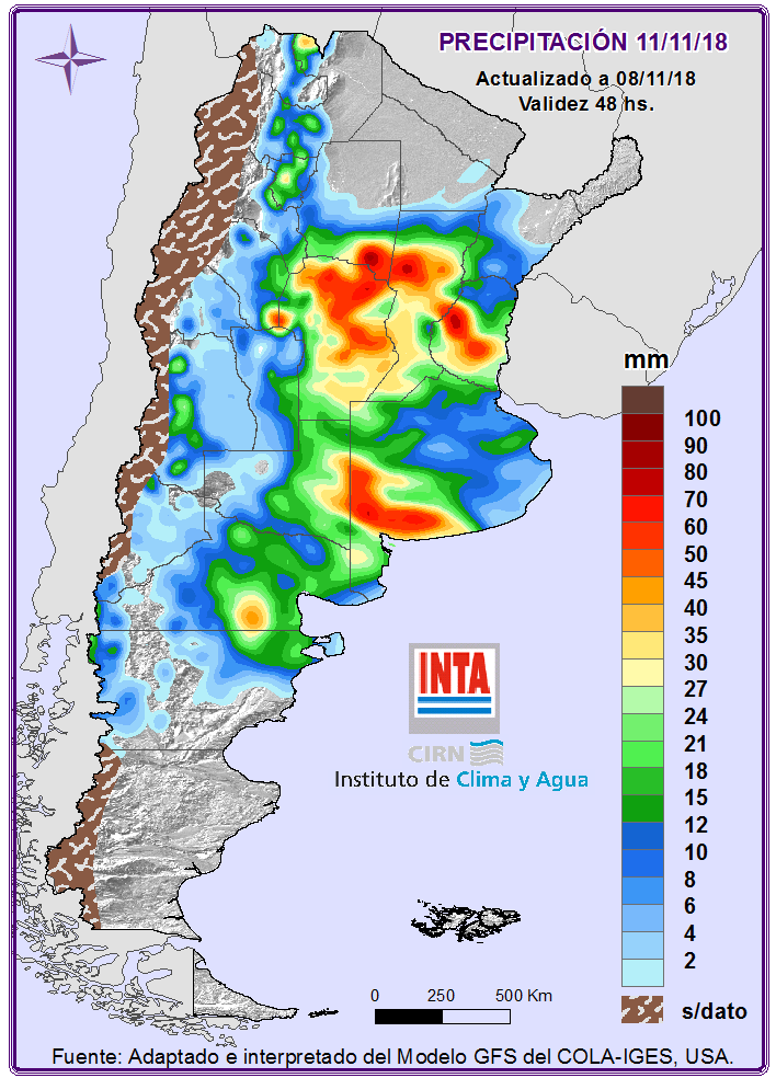 Persisten las condiciones de tiempo nuboso con probables lluvias y tormentas de variada intensidad sobre el norte patagónico, centro del país, NEA (sur) y NOA (oeste y sur); algunas podrían ser localmente intensas con abundante caída de agua y ráfagas, especialmente sobre la reg. Pampeana. Se registrarían vientos moderados del sector sudeste y este con posterior descenso de las temperaturas. En el extremo norte del territorio se registrarían elevadas temperaturas con vientos moderados del sector noreste y aumento de la nubosidad hacia la noche. Sobre el sur patagónico se espera tiempo soleado con vientos del sector norte y ascenso de las temperaturas.