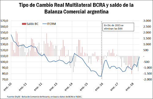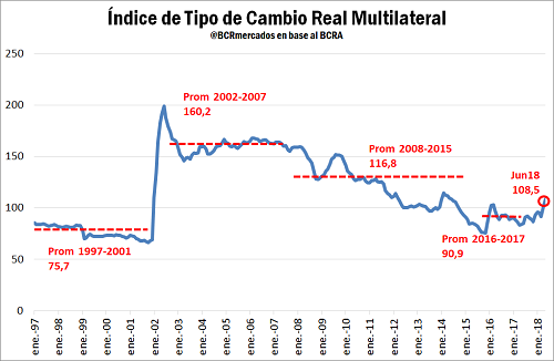 A partir del año 2008, paulatinamente, inició un proceso tendencial de apreciación real vinculado mayormente a una suba del nivel general de precios internos, más que proporcional al incremento de los precios externos, según el BCRA. Si bien esta tendencia tuvo leves interrupciones con las depreciaciones nominales del 2009, comienzos de 2014 y fines de 2015, la eliminación de los controles de cambio en 2015 y el blanqueo del 2016 impulsaron una significativa entrada de capitales que mantuvo vigente la apreciación de la moneda nacional. Recién a mediados de este año, esta tendencia se revierte y el ITCRM cambia su tendencia decreciente para subir a 108,5. Este valor, si bien se ubica un 19% más arriba respecto a su promedio en el bienio 2016 y 2017, aún se encuentra un 7% por debajo del promedio 2008-2015 y un 32% por debajo del promedio 2002-2007.
