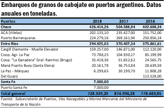 A lo largo del 2018, se embarcaron en operaciones de cabotaje poco más de 728 mil toneladas de granos, correspondientes a los cultivos de soja, maíz y trigo. Este registro implica una merma del 16,8 % en relación a las 875 mil toneladas que se transportaron dentro del país por vías navegables en el año previo.