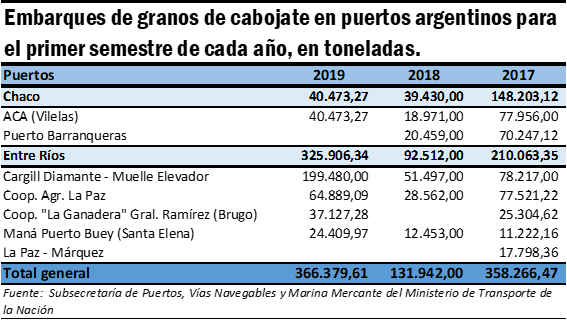 Analizando los datos disponibles para este año, correspondientes al primer semestre, se observa una evolución más que favorable en los embarques de granos para operaciones de cabotaje. En la primera mitad del 2019, se despacharon desde las terminales de Chaco, Entre Ríos cerca de 370 mil toneladas. Este registro refleja un crecimiento extraordinario del 177 % respecto al volumen operado en igual período del año previo y aumento del 2,5 % en relación al primer semestre del año 2017. Cabe mencionar que el año pasado a causa del impacto negativo de la sequía sobre la producción no se registraron movimientos de granos a través de las vías navegables en el segundo trimestre del año.