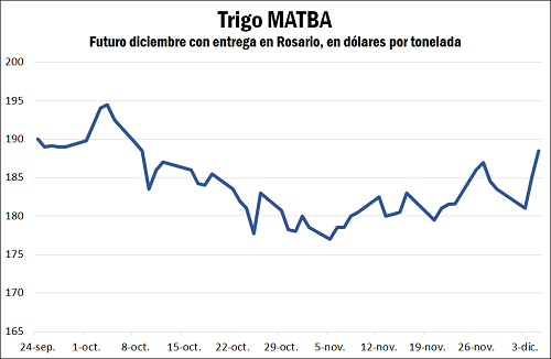 El futuro más cercano negociado en MATBA, con vencimiento en diciembre, ajustó el miércoles a US$ 190/t, el valor más alto de los últimos dos meses a pesar de la mayor oferta estacional en plena cosecha. Por el lado de la oferta esta viene afectada negativamente por heladas, déficit de agua y granizo, y la demanda alentada por oportunidades de negocios de exportación.