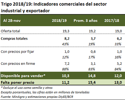 Del lado de la demanda, en tanto, el sector exportador ha mostrado un vigor sin precedentes. La campaña 2018/19, que formalmente inició el 1ro de diciembre, registró compras anticipadas de cereal por 8,2 millones de toneladas, un récord histórico de comercialización pre-cosecha. De este total, más del 90% corresponde a compras anticipadas del sector exportador, habiéndose comercializado con precios en firme una mayor proporción que años anteriores, tal como muestra el cuadro adjunto