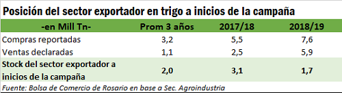 De las 7,6 Mt de trigo que lleva comprado el sector exportador específicamente, a la fecha se han vendido al exterior 5,9 Mt, un récord histórico para inicios del mes de septiembre. En términos netos, ello indica que el sector exportador tiene a inicios de la campaña un stock en torno a los 1,7 Mt, muy por debajo de los 3,1 Mt con los que iniciaba la campaña anterior y algo por debajo también de los 2,0 Mt que en promedio tenía en sus manos los últimos tres años.