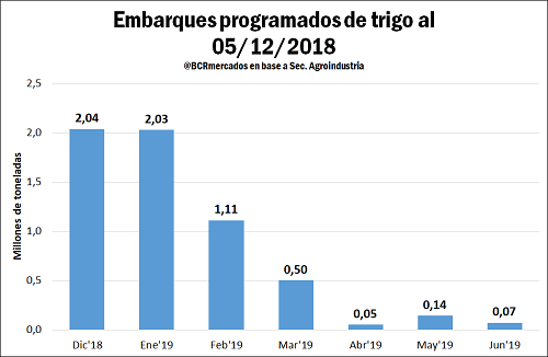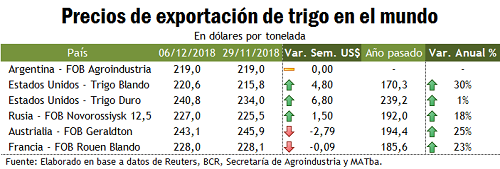 En relación al flujo de comercio internacional de trigo, los despachos estadounidenses informados por el Departamento de Agricultura de los Estados Unidos totalizaban a fines de noviembre 9,5 millones de toneladas, 2 Mt por debajo de la marca de la campaña anterior. Su principal rival, el trigo ruso, muestra un mejor ritmo de exportaciones pese a tener un precio menos competitivo y haber sufrido un recorte en su producción como consecuencia del mal clima que entorpeció la campaña. Según SovEcon, Rusia, el principal exportador de trigo del mundo, llevaba exportado a fines de noviembre 20,4 Mt del cereal y se estima que sus despachos totalicen 34,7 Mt este ciclo. A través de la conquista comercial de nuevos mercados en Medio Oriente y en el norte de África, la Federación Rusa lograría aumentar aún más su participación en el mercado internacional.