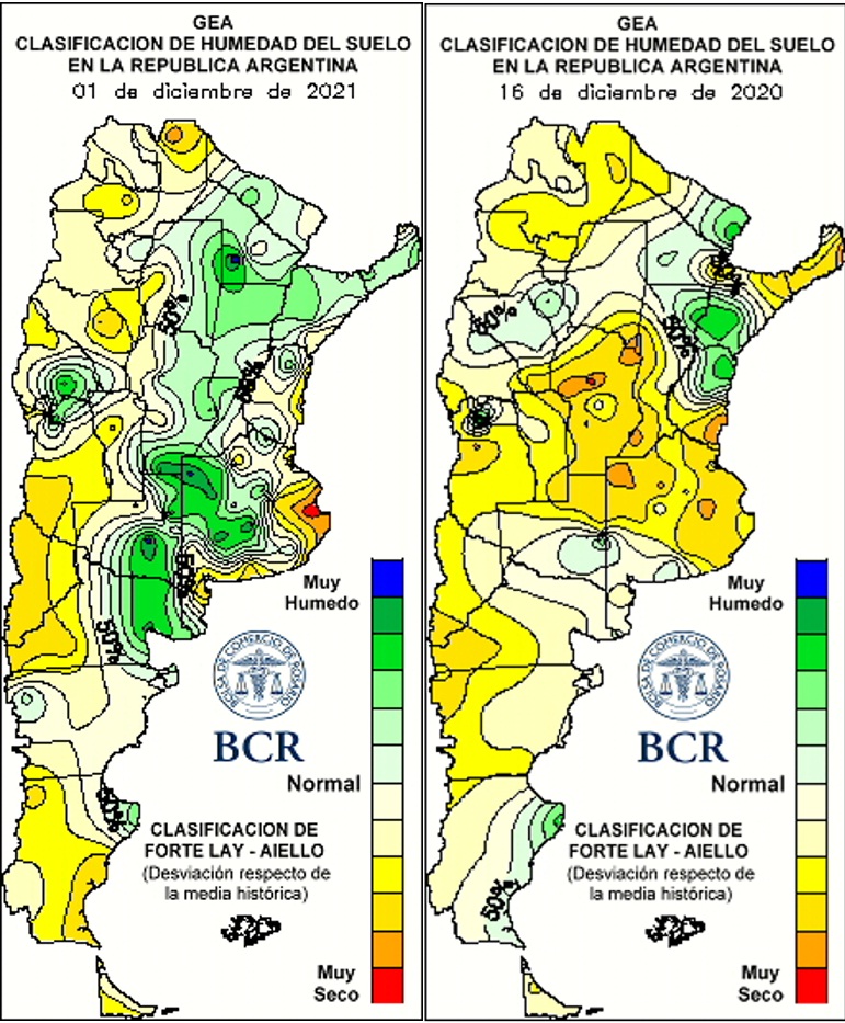 Se lleva sembrado el 60% de las 7,96 M de hectáreas intencionadas. Por un lado hay optimismo: de octubre a noviembre las lluvias reflejaron medias que superaron las mejores expectativas. El resultado es un cambio notorio de reservas en el suelo en los primeros dos metros del suelo. Lejos del estrés termo hídrico que ya encendía las alarmas el año pasado, los cuadros están en condiciones muy buenas. Empiezan a transitarse los primeros días de etapas críticas en el centro de Santa Fe.