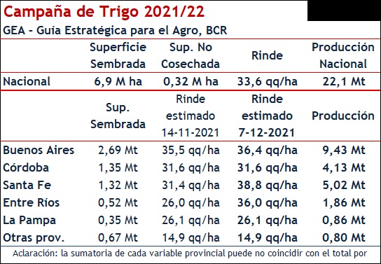 Los ajustes son por la cosecha: con un 57 % de avance, los promedios están sorprendiendo. La campaña también alcanzó un nuevo nivel de siembra: es la mayor de los últimos 19 años, con 100.000 ha más y 6,9 M de ha implantadas. Los promedios de rindes están entre las marcas más altas, muchos son récords en el centro de la región pampeana, como en el centro y sur de santa fe. Los nuevos ajustes elevan el rinde promedio de argentina de 31 quintales en noviembre a 33,6 qq/ha en diciembre. La nueva estimación señala la fuerte alza con 22,1 M Tn, y para el guarismo se tienen en cuenta una pérdida de superficie de 320 mil ha.