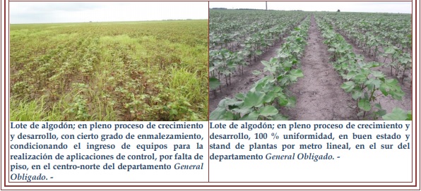 Zona este: al igual que en otros cultivos, la incidencia de las precipitaciones tuvo su impacto en los lotes sembrados tardíamente, en las últimas semanas, donde se habían resembrado y nuevamente se encuentraron con excesos hídricos, generando dificultades de germinación, crecimiento y pérdidas de plantas. Los cultivares implantados con anterioridad continuaron su ciclo normalmente en crecimiento y desarrollo de las plantas, presentando buen estado, con humedad adecuada en el perfil del suelo y con temperaturas algo elevadas para la época. Continuó el monitoreo de las trampas para la detección de la presencia de picudos en los predios o cercanía de los mismos, realizándose aplicaciones, en caso de necesidad. Zona oeste: continuó un par de días el proceso de siembra en dicha área, luego quedó interrumpido por las precipitaciones, generando consecuencias ante la finalización del período de siembra establecido por el SENASA. Situación que se