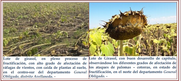 Período con eventos climáticos de cierta magnitud, como ráfagas de vientos, caída de granizo y precipitaciones, en lotes puntuales del departamento General Obligado, produjeron caída de plantas y dañaron capítulos, que sumado a los ataques de palomas y cotorras, ya enunciados, fueron los daños y perjuicios que se relevaron hasta le fecha, los cuales irían en detrimento de los futuros rendimientos, principalmente, con mayor impacto en el sector centro – noreste del área de estudio. Un 93 % del cultivo implantado se encontró en estado bueno a muy bueno, con algunos lotes excelentes, un 5 % en estado bueno a levemente regular y un 2 % en estado regular a malo. La variación del estado de los cultivares fue consecuencia de las condiciones climáticas que reinaron en la semana. Se detectó muy buen estado sanitario, no presentándose inconvenientes de patógenos ni de insectos. Se observaron los siguientes estados fenológicos: R “estados reproductivos”, R2 (distancia de menos de 2 cm entre la inserción del botón floral y la última hoja), R3 (distancia de más de 2 cm entre la inserción del botón floral y la última hoja), R5 “antesis” R5 – 1 (inicio de antesis), R5 – 5 (mitad de floración 50 %, el % dependiendo del área del capítulo cubierto por flores, cantidad de círculos), en lotes más avanzados en R6 (fin de floración, caídas de flores liguladas) y muy puntuales en comienzo de R7 (la parte de atrás del capítulo comenzó a ponerse amarillento).