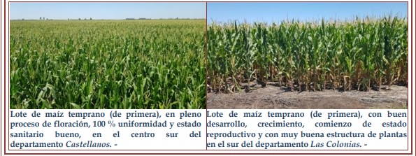 Las precipitaciones registradas en toda el área encontraron a los cultivares en pleno desarrollo de “estados reproductivos”, siendo el cultivo más beneficiado, particularmente, porque ante dicha disponibilidad de agua útil en el suelo, aseguraría condiciones muy buenas casi óptimas, para dicha etapa, que campaña tras campaña se la denominó “punto crítico” y definiría en gran parte los futuros rendimientos y la producción final. Un 98 % del cultivo se halló en estado bueno a muy bueno, con lotes excelentes y un 2 % en estado regular. La sanidad detectada fue buena, sin manifestaciones de ataques de enfermadades ni de plagas. Se observaron los siguientes estados fenológicos: V “estados vegetativos”, V3 (3º hoja desarrollada), V4 (4º hoja desarrollada), V5 (5º hoja desarrollada), V6 (6º hoja desarrollada), V7 (7º hoja desarrollada), V8 (8º hoja desarrollada), V9 (9º hoja desarrollada), V10 (10º hoja desarrollada), Vt (panojamiento), R “estados reproductivos”, R1 (emergencia de estigma), R2 (cuaje – ampolla), R3 (grano lechoso) y lotes puntuales más avanzados en R4 (grano pastoso).