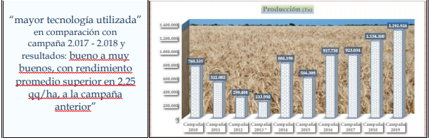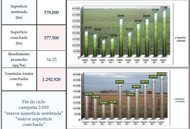 Fin del ciclo del cultivo, con una superficie sembrada de 378.000 ha, superficie cosechada de 377.500 ha, rendimiento promedio de 34,25 qq/ha y una producción de 1.292.928 tn.