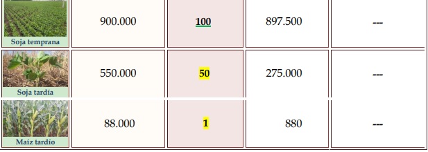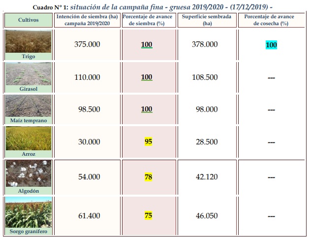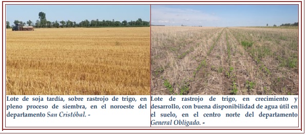 El proceso de siembra presentó un grado de avance del 60 %, aproximadamente unas 330.000 ha de las 550.000 ha previstas inicialmente, con un retraso de 10 puntos, en comparación con similar período de la campaña pasada. La implantación se interrumpió por los eventos mencionados en un principio, los que generaron ciertos problemas en los últimos lotes sembrados y consecuencias en la germinación y emergencia, situación que se revertiría con el transcurso de los días y se iría evaluando, si existiese o fuese necesaria la resiembra. Continuaron las aplicaciones de herbicidas de preemergentes, para un buen control de malezas. Se observaron, los siguientes estados fenológicos: V “estados vegetativos”, VE (emergencia), Vc (estado de cotiledón, hojas unifoliadas pegadas), V1 (1º nudo), V2 (2º nudo) y en lotes más avanzados en V3 (3º nudo)