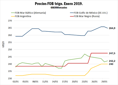 El recorte productivo australiano, en comparación con la campaña anterior, se debe a la dura sequía que afectó a la parte oriental que aporta la mitad del total del trigo del país oceánico. Como consecuencia de la falta de lluvias en esta región los rindes se redujeron notablemente y hasta hubo campos dejados al pastoreo; la producción estimada sería la menor desde 2007/2008. El retroceso de la producción en Rusia, en tanto, se daría por menores rindes en el trigo de invierno, especialmente en algunas regiones críticas de la Federación. En respuesta a la caída productiva, el precio FOB del trigo en el puerto ruso Novorossiysk del Mar Negro aumentó US$ 10/t en enero alcanzando los US$ 248/t a fin de mes.
