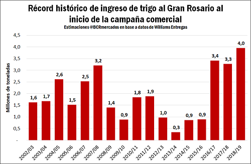 En el plano local, el inicio de la campaña comercial 2018/19 en Argentina anotó un ingreso récord de trigo a las terminales portuarias del Gran Rosario en los meses de diciembre 2018 y enero 2019. En total, fueron 4 millones de toneladas las que se volcaron a los puertos de nuestra zona, 700.000 toneladas más que en el primer bimestre de la campaña pasada y 20% por encima del récord anterior alcanzado en el ciclo 2016/17.