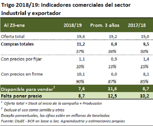 En línea con lo anterior, se registra al 23 de enero compras del sector exportador por un volumen récord histórico para esta altura del año de 9,7 millones de toneladas, o el 60% de la producción estimada. Si sumamos a la oferta los stocks al inicio del ciclo, y a las compras el volumen ya adquirido por el sector industrial, se tiene que ya se ha comercializado el 57% del trigo disponible para toda la campaña, por encima del 50% registrado a la misma altura del año pasado y superando ampliamente el 36% promedio de los últimos tres años.