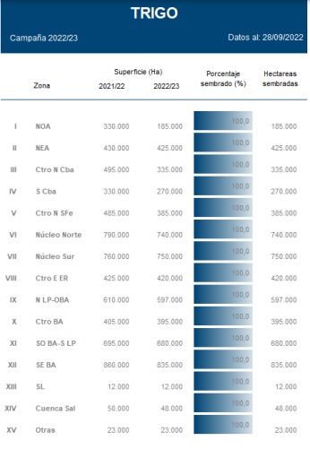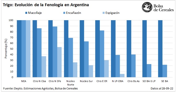 Actualmente, el 50,3 % del área en pie presenta condición hídrica Regular/Seca, y un 45,9% mantiene una condición de cultivo Regular/Mala. En las regiones NOA y NEA, el cereal se encuentra entre espigazón y madurez fisiológica con rendimiento esperados entre 5 y 18 qq producto de la ausencia de lluvias y las heladas tardias.