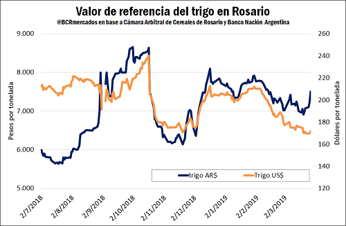 A diferencia del maíz y la soja, el valor ofrecido por el cereal de invierno se incrementó esta semana en el mercado local incluso valuado en dólares, de la mano de la suba externa de precios y con el soporte que le da un ajustado balance de oferta y demanda para la campaña actual. En Chicago, los futuros del cereal encuentran apoyo en los temores sobre una demora en la siembra de primavera y la reactivación de la demanda externa