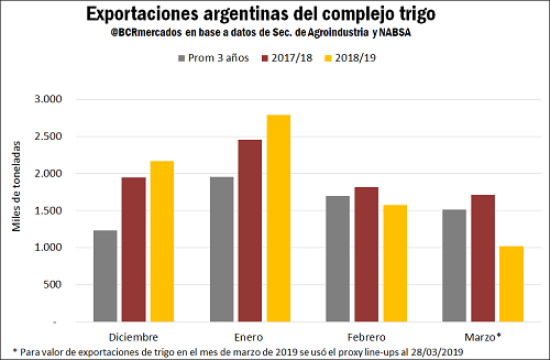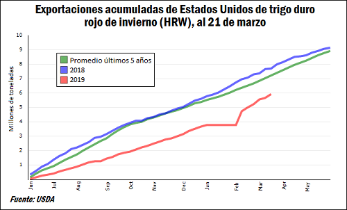 Respecto de las exportaciones de trigo estadounidense, tomando como referencia las inspecciones semanales del USDA, éstas se encuentran por debajo del volumen exportado la campaña pasada a la misma fecha. Desde el inicio del ciclo comercial de trigo en Estados Unidos el 1 de junio hasta el 21 de marzo, las inspecciones del Departamento de Agricultura totalizaron 18,3 millones de toneladas, por debajo de las 19,5 Mt registradas a igual fecha en 2018.